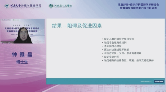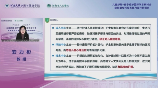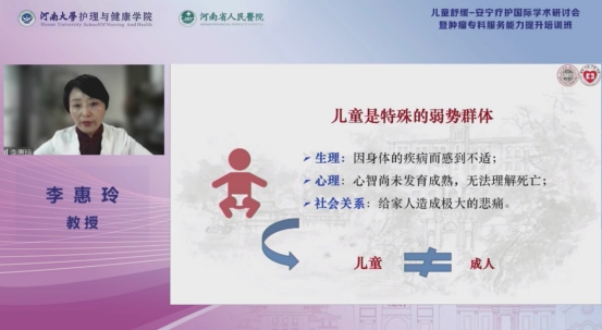 資深兒童安寧療護教育講師Amy Haskamp教授作《兒童舒緩療護模式簡介》報告,她從兒童健康照護的發(fā)展歷史講到重癥患兒照護的倫理問題,提出舒緩療護和臨終關(guān)懷的區(qū)別與聯(lián)系和如今兒童舒緩療護的理念和目標(biāo),她還分享《兒童舒緩療護相關(guān)倫理及法律問題》《兒童舒緩療護中的癥狀管理》《親人離世后的哀痛輔導(dǎo)》等專題內(nèi)容;波士頓學(xué)院康乃爾護理學(xué)院臨床教授Vanessa Battista作《圍產(chǎn)期及新生兒的舒緩療護》《兒童疼痛管理》《溝通》《患兒離世前期的照護》等四篇報告;北京大學(xué)護理學(xué)院孫宏玉教授作《護理學(xué)專業(yè)人才培養(yǎng)中人文關(guān)懷的重要性》報告,提出要重視護理專業(yè)人文關(guān)懷能力的培養(yǎng);中南大學(xué)湘雅護理學(xué)院院長唐四元教授以《兒童居家安寧療護發(fā)展》為題,介紹兒童居家安寧療護的定義和優(yōu)勢,為兒童安寧療護更好地發(fā)展指明方向;天津醫(yī)科大學(xué)護理學(xué)院黨委書記趙岳教授在《孤獨癥譜系障礙兒童的健康管理》報告中講述我國孤獨癥兒童的服務(wù)情況和孤獨癥的病因與臨床表現(xiàn),提出治療原則與方法;大連大學(xué)護理學(xué)院院長安力彬教授以《兒童護理人文關(guān)懷》為主題介紹兒童護理的重要性,講述兒童護理與人文關(guān)懷的技巧;蘇州大學(xué)醫(yī)學(xué)院護理學(xué)院院長李惠玲教授在《兒童舒緩與安寧療護敘事》中闡述兒童安寧療護的核心和具體方法;首都醫(yī)科大學(xué)副教授岳鵬以《兒童緩和醫(yī)療中的家庭會議》為題,闡述兒童緩和醫(yī)療中的家庭會議的未來發(fā)展方向;美國伯明翰大學(xué)護理與助產(chǎn)學(xué)院副教授郭平作《舒緩醫(yī)療在全球范圍內(nèi)的發(fā)展及應(yīng)用》的演講,講述舒緩醫(yī)療在全球的的發(fā)展與應(yīng)用;鄭州第九人民醫(yī)院副院長李玲作《安寧療護中的兒童服務(wù)實踐》報告,深入講解了人為關(guān)懷在兒童姑息治療與安寧療護的治療建議;首都醫(yī)科大學(xué)副教授周翾的《介紹國內(nèi)兒童舒緩療護的發(fā)展及現(xiàn)況》分析國內(nèi)兒童舒緩療護的現(xiàn)狀、資源分布和未來展望;馬偕兒童醫(yī)院醫(yī)師勞萱之作《亞洲地區(qū)重癥患兒疼痛及癥狀處理》的報告,介紹了亞洲地區(qū)重癥患兒疼痛及癥狀處理的方法;南京醫(yī)科大學(xué)方擁軍教授通過《公立醫(yī)院兒童安寧療護的實踐與思考》為護理人員介紹豐富的兒童安寧療護的方法與技巧;博士生鐘雅晶以《Physicians'attitudes and experiences towards withholding/withdrawing life-sustaining treatments in pediatric patients:a systematic review of quantitative evidence》為題,講述兒童治療中大多數(shù)醫(yī)生愿意和父母及兒童一同做決定,為解決兒童相關(guān)臨床醫(yī)療問題提供借鑒。