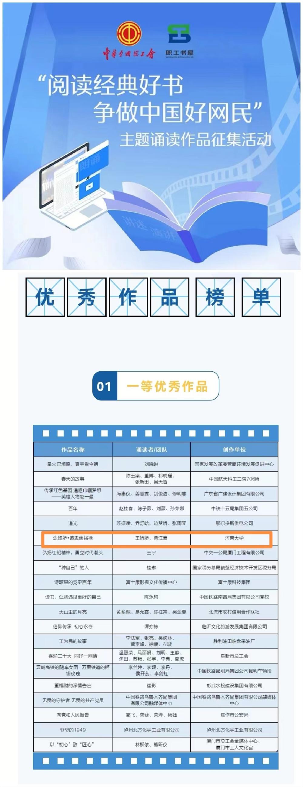 校工會(huì)選送的《念奴嬌·追思焦裕祿》榮獲本次全國主題誦讀作品征集活動(dòng)一等優(yōu)秀作品。這是繼我校選送的《念奴嬌·追思焦裕祿》先后斬獲開封市總工會(huì)、河南省教科文衛(wèi)體工會(huì)、河南省總工會(huì)三個(gè)級(jí)別的職工經(jīng)典誦讀活動(dòng)一等獎(jiǎng)以來,第四次獲得更高級(jí)別的一等獎(jiǎng),也是全國唯一獲此殊榮的高校!