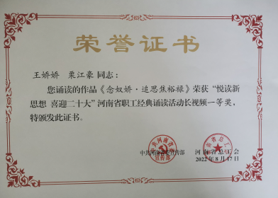 河南省總工會(huì)職工經(jīng)典誦讀活動(dòng)一等獎(jiǎng)