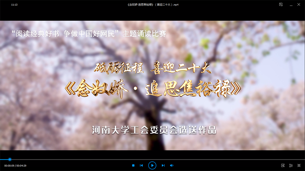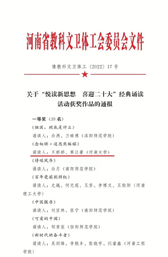 近日,由河南大學(xué)工會(huì)委員會(huì)選送的《念奴嬌·追思焦裕祿》榮獲全國“閱讀經(jīng)典好書 爭(zhēng)做中國好網(wǎng)民”主題誦讀作品征集活動(dòng)一等獎(jiǎng),我校成為全國唯一獲此殊榮的高校。