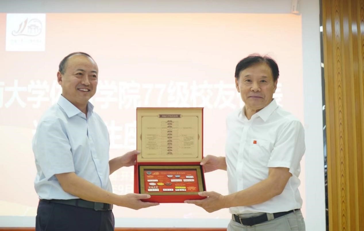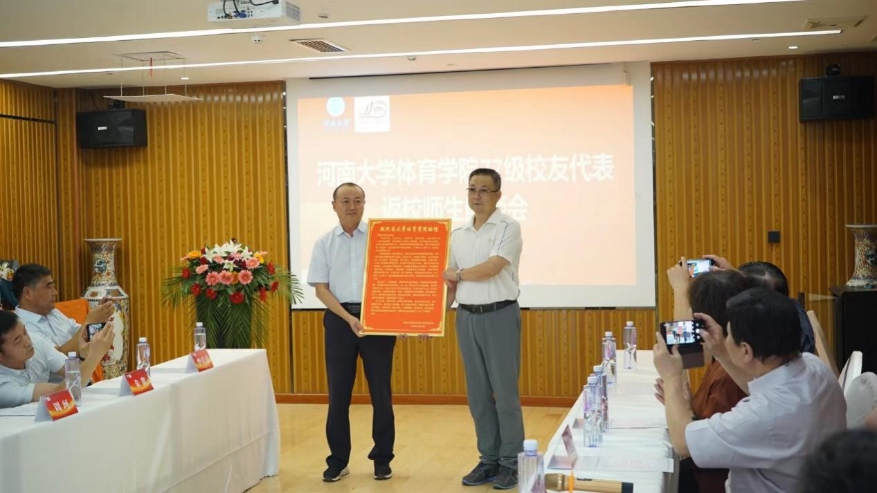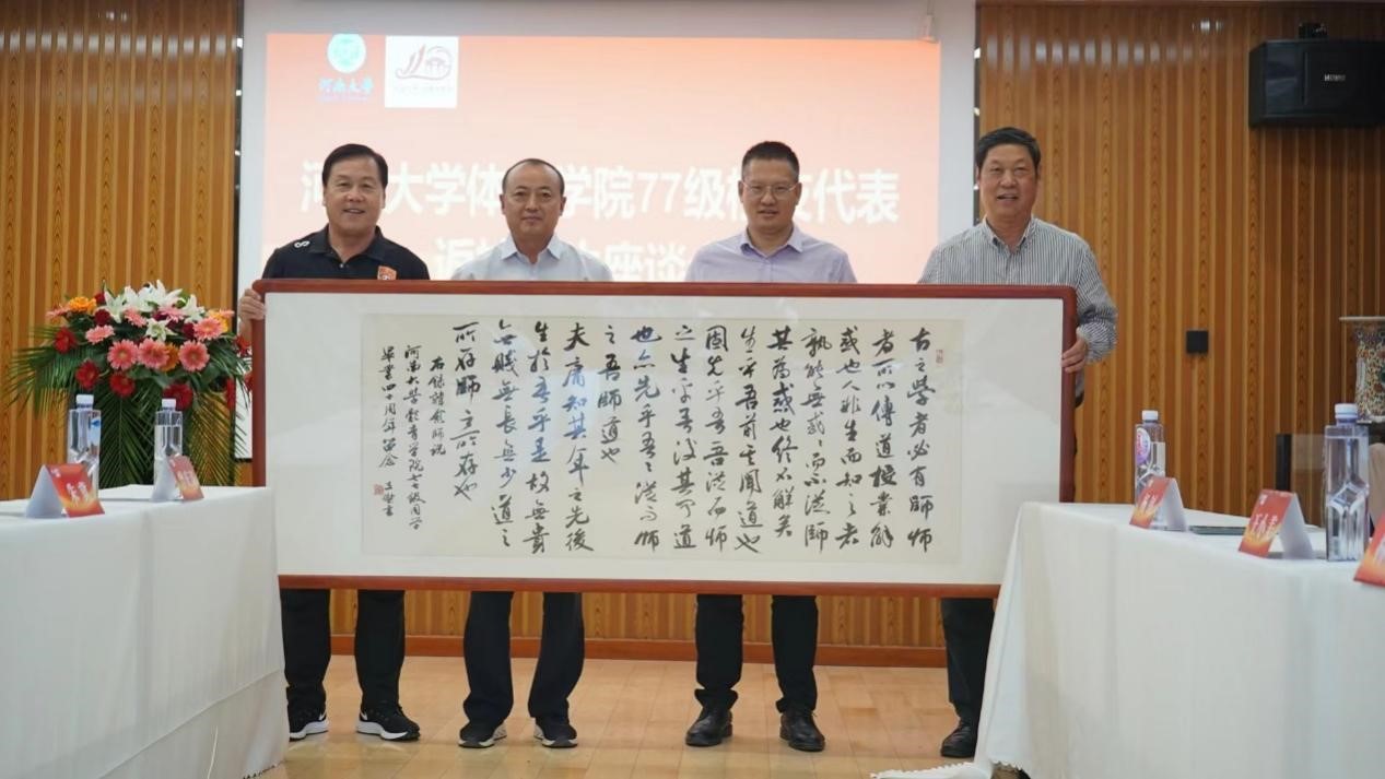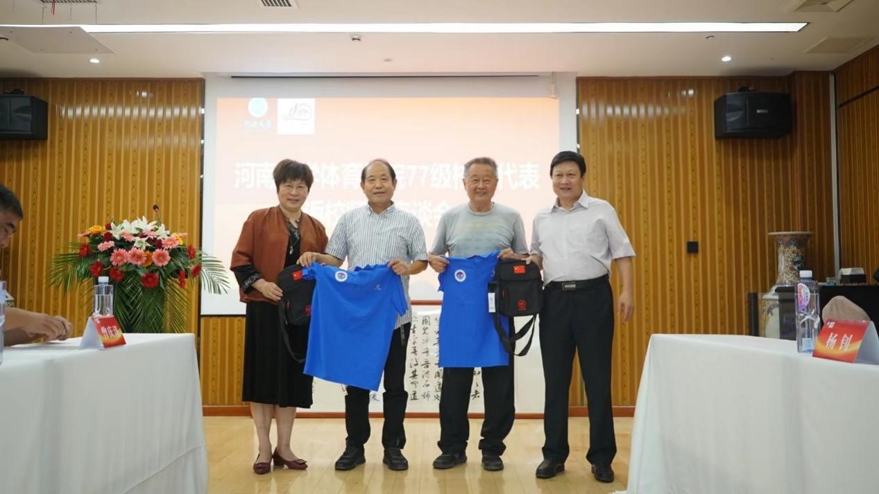 校友河南省體育局原副局長張躍敏、開封市教育體育局原副局長楊釗代表77級校友向體育學院贈送書法作品《師說》,感念師生情。校友鄭州大學體育學院(校本部)原院長林克明、河南財經政法大學體育學院原院長崔偉和信陽師范學院體育學院原院長王小美向老教師們獻上鮮花并贈送印有專門LOGO的紀念衫、紀念背包。段廷良代表體育學院向77級校友代表贈送河南大學110周年校慶專屬紀念品徽章。