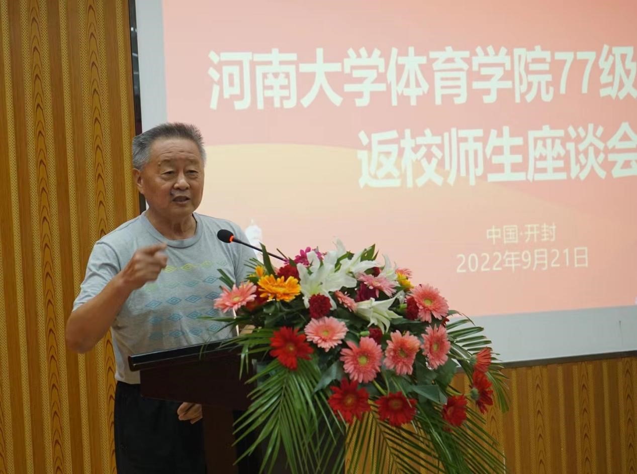 教師代表河南大學體育學院原副院長栗勝夫對校友的關心和慰問表示感謝,談起當年教77級學生時的場景,對校友們取得的成就表示欣慰,表達了能與畢業學生、學院領導班子成員共聚一堂的喜悅感動之情。