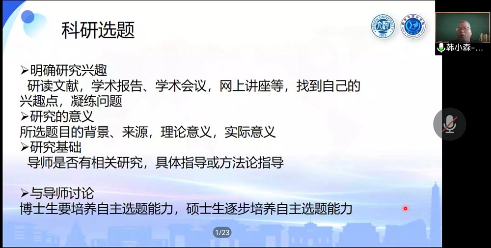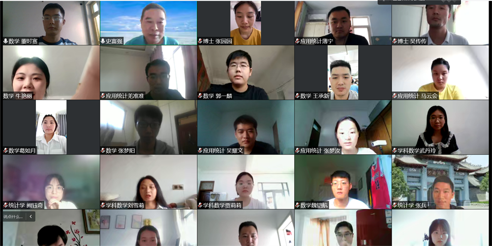 9月6日下午,史富強以“院史院情教育”為主題,首先對當前開封市和我校的疫情防控形勢進行了介紹,對同學們疫情期間的健康狀況表示關切,并代表學院表達了對全體2022級研究生新生的熱烈歡迎。接著講述了河南大學輝煌的歷史、艱難曲折的發展道路以及逐步復興的歷程。然后以學院的發展史為切入點,詳細介紹了黃際遇、陳作鈞、樊映川、黃敦慈、杜孟模、劉亞星等先后在學院執教的著名數學家和教育家,他們為學院的發展作出了巨大貢獻,令同學們身臨其境,感受頗深。最后,史富強勉勵同學們要加強體育鍛煉,在學習生活中養成獨立思考、解決問題的能力,提升自身綜合素質,努力成為創新型、應用型、復合型優秀人才。會議結束時,史富強與同學們“云”合影留念。