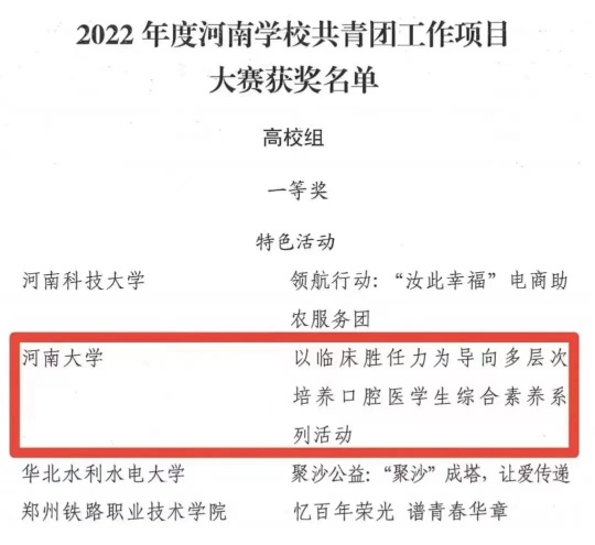 近日,口腔醫學院“以臨床勝任力為導向多層次培養口腔醫學生綜合素養系列活動”項目榮獲2022年度“活力杯”河南學校共青團基層基礎工作大賽一等獎。