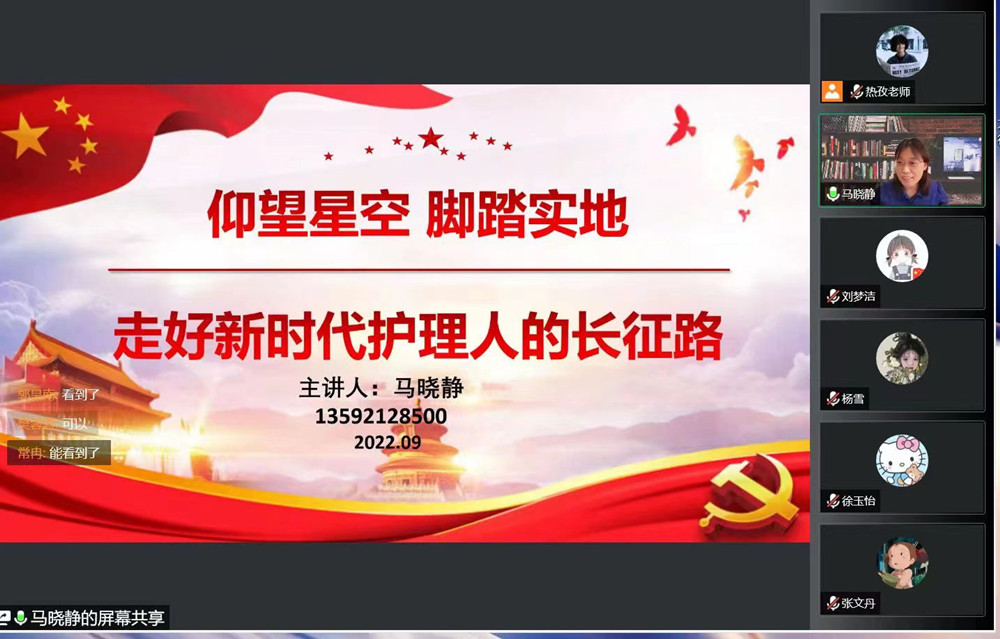 9月4日上午,為引導2022級本科新生正確認識“小我”和“大我”,激勵同學們將榮校、愛國、報國作為奮斗目標,護理與健康學院黨委書記馬曉靜為2022級新生作題為《仰望星空腳踏實地——走好新時代護理人的長征路》的講座,全體2022級本科新生線上參會,會議由2022級本科輔導員熱孜萬古麗·黑木都老師主持。