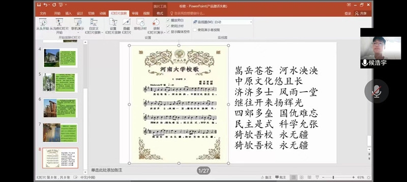 9月3日下午是“學(xué)唱校歌”專題,魏森杰向新生同學(xué)詳細講解了河南大學(xué)校歌的創(chuàng)作背景與創(chuàng)作過程,隨后,她帶領(lǐng)同學(xué)們一起學(xué)唱校歌,“嵩岳蒼蒼,河水泱泱,中原文化悠且長。濟濟多士,風(fēng)雨一堂,繼往開來揚輝光。四郊多壘,國仇難忘。民主是式,科學(xué)允張。猗歟吾校,永無疆。猗歟吾校,永無疆!”那雄渾激昂的旋律,蘊涵著以自強不息、百折不撓為核心的大學(xué)精神,在欣賞和學(xué)唱的過程中,新生同學(xué)為之深深感動,沉浸其中。