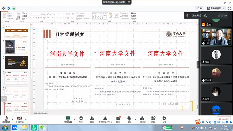 9月4日上午是“規(guī)章制度專題”,學(xué)院黨委副書記趙艷忠按照“日常管理類制度”“獎勵類制度”“處罰類制度”,帶領(lǐng)同學(xué)們重點學(xué)習(xí)了《河南大學(xué)全日制普通本科學(xué)生管理規(guī)定》《河南大學(xué)全日制普通本科學(xué)生學(xué)籍管理規(guī)定》《河南大學(xué)全日制普通本科學(xué)生考勤與請銷假管理辦法》《河南大學(xué)全日制普通本科學(xué)生獎勵辦法》《河南大學(xué)全日制普通本科學(xué)生國家獎助學(xué)金管理辦法》《河南大學(xué)全日制普通本科學(xué)生違紀處分辦法》等規(guī)章制度,并要求同學(xué)們在入學(xué)教育期間,自主學(xué)習(xí)其他規(guī)章制度。他希望同學(xué)們遵規(guī)守紀,堅守底線,不觸紅線,奮發(fā)有為,不負青春韶華。