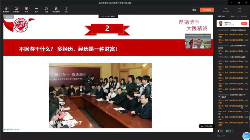 隨著2022級新生報到加入,臨床醫學院現有本科生1613人,研究生1085人。此次分享會是臨床醫學院2022級本科新生引航工程系列活動的一部分。根據學生處、研究生院有關要求,近期,臨床醫學院將邀請有關專家、校友,對2022級新生開展愛黨愛國教育、專業思想教育、心理健康教育、民族團結和宗教政策教育、考研啟蒙教育等,引導新生盡早適應大學生活,主動規劃學業,全面成長成才。