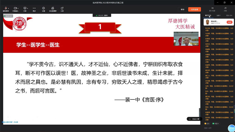 9月3日上午,臨床醫學院2022級本科新生引航工程首場報告會舉行,臨床醫學院黨委書記謝納澤通過釘釘會議平臺,以“我對大學的理解和對大家的期待”為題,給學院全體2022級本科新生做分享交流。分享會由2022級本科生輔導員常昊主持。