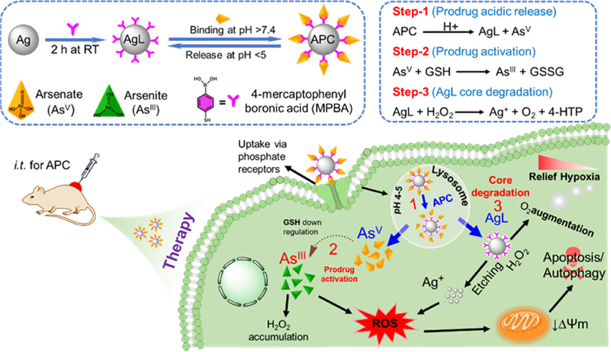 針對還原及乏氧的腫瘤微環境,實驗室設計了一種由銀納米粒子及表面螯合的砷V組成的砷基納米藥物。其具有GSH應激釋放及內涵體逃逸特性,能夠通過抑制腫瘤細胞內的GPx及SOD,實現LC3自噬介導的細胞凋亡,進而有效抑制腫瘤細胞增殖。實驗結果表明,砷基納米藥物在腫瘤治療及原位檢測方面有著巨大的應用前景。該成果發表在ACS Applied Materials & Interfaces 2022, 14, 32, 36487–36502(IF=10.383,SCI一區期刊)。博士研究生閆紀亮、博士后研究員Sumaira Hanif為該論文共同第一作者,吳海剛博士、Pir Muhammad博士為共同通訊作者。