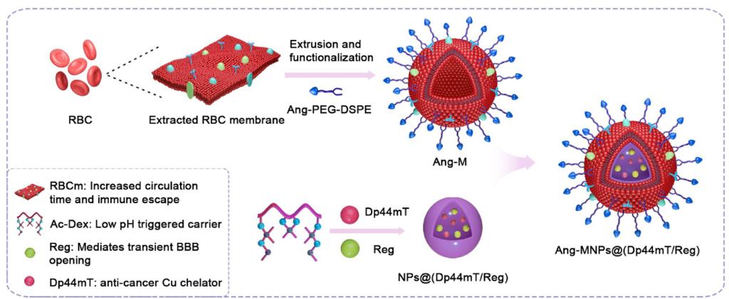 利用螯合劑2-(二-2-吡啶基亞甲基)-N,N-二甲基肼基硫代甲酰胺(Dp44mT)可選擇性靶向癌細胞中高濃度的銅離子并產生大量活性氧(ROS)來殺傷腫瘤細胞這一特點,實驗室將Dp44mT與血管擴張劑瑞加德松(Reg)共同裝載到納米粒子中,外部修飾靶向多肽Angiopep-2功能化的紅細胞膜(Ang-M)。實驗證明,該主動仿生納米藥物Ang-MNPs@(Dp44mT/Reg)可以有效穿越血腦屏障(BBB),主動靶向GBM病灶,且血液循環時間長,毒副作用低。U87MG-luc原位GBM模型小鼠實驗表明,其能夠有效抑制腫瘤生長并延長荷瘤小鼠的生存周期。該納米遞送系統還可拓展為一體化平臺應用于腦部疾病的診療。該成果發表在Biomaterials 2022, 289, 121760(IF=15.305,SCI一區期刊)。博士后研究員Muhammad Ismail、研究生楊汶、李彥飛為該論文共同第一作者,冰洋教授、David B. Lovejoy教授為共同通訊作者。