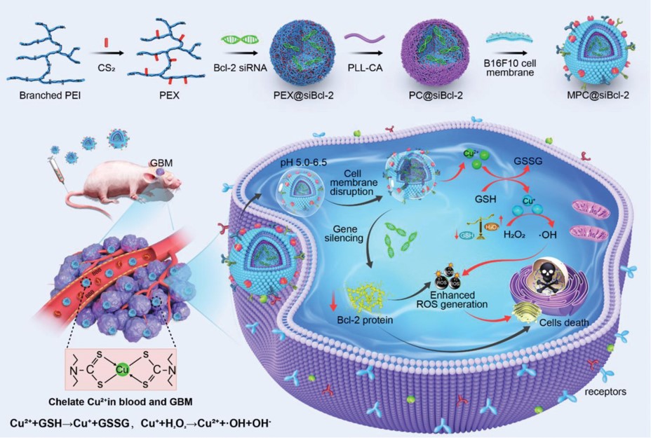 利用化學動力學療法(CDT)具有無侵襲性和高響應性這一特點,實驗室開發了以轉移性黑色素瘤細胞膜為外殼、電荷轉化賴氨酸為中間層、siRNA絡合的聚乙烯亞胺黃原酸酯(PEX)為內核的仿生納米藥物。其可有效穿透BBB,PEX螯合腫瘤細胞中豐富的銅離子,不僅導致GSH的耗竭,而且生成能殺死腫瘤細胞的羥基自由基(·OH)。同時,抗凋亡蛋白Bcl-2的基因沉默導致ROS水平的增加,從而誘導GBM細胞凋亡級聯反應。在皮下黑色素瘤和原位GBM腫瘤模型中均展現優異的治療效果及延長的生存周期。該成果發表在Advanced Functional Materials 2022, 2209239(IF=19.925,SCI一區期刊),博士研究生張東亞為第一作者,冰洋教授、鄭蒙教授和鄒艷副教授為共同通訊作者。