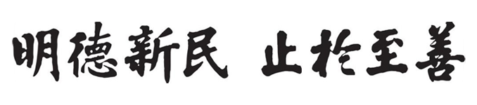 “明德,新民,止于至善”取自《大學(xué)》開(kāi)篇:“大學(xué)之道,在明明德,在親民,在止于至善。”這些話(huà)言簡(jiǎn)意賅地道出辦大學(xué)的原則在于發(fā)揚(yáng)光明的德性,革新民心,達(dá)到完善。“明明德”,意指彰明美德,就是告誡師生通過(guò)學(xué)習(xí)和實(shí)踐培養(yǎng)優(yōu)良品德。“親民”又為“新民”,意為啟迪百姓心智,使百姓棄舊圖新,去惡從善,這就是將自己的美好道德推己及人,不斷求取進(jìn)步。對(duì)于“止于至善”,宋代碩儒朱熹在《大學(xué)章句》中解釋說(shuō):“止者,必至于是而不牽之意;至善,則事理當(dāng)然之極也。言明明德、新民,皆當(dāng)止于至善之地而不遷。”也就是說(shuō),修身育人,都必須達(dá)到完美的境界而毫不動(dòng)搖。